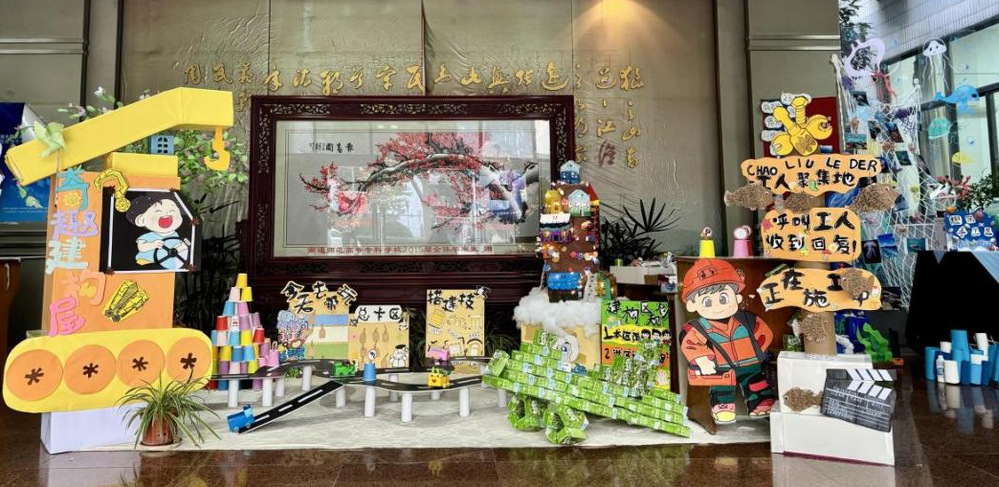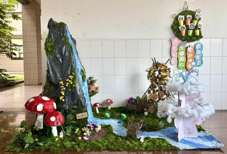 此外,主题场景与艺术装置创意十足:不仅有利用矿泉水瓶、脸盆、报纸做底搭建的桃树,还有以假山、瀑布等勾勒出的山水意境,充满自然意趣。强调低成本、环保、安全的同时充分体现出学前教育专业的实操能力。