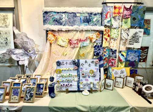 非遗传统美学展览区域满是浓郁的文化底蕴与雅致韵味!“非遗小铺” 里,泥塑的憨态、琵琶的精巧、云肩的华美尽数呈现,将传统工艺的精髓与童真巧思巧妙融合;“云染工坊” 的扎染作品更是自带古朴韵味,蓝白二色在布料上自然晕染、交织蔓延出多样化的手工创意衍生品,尽显传统染艺的独特魅力。